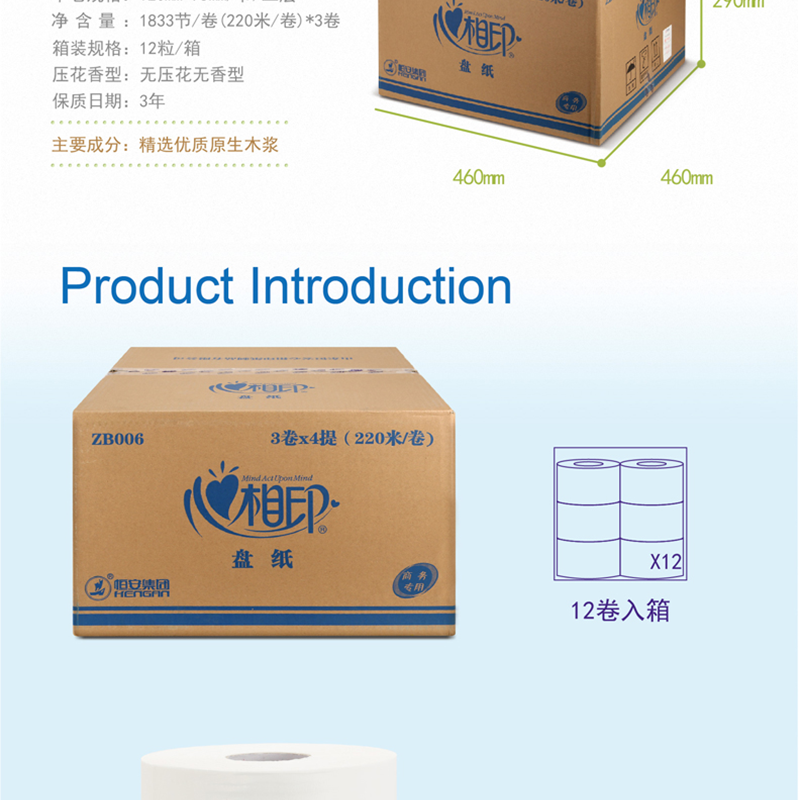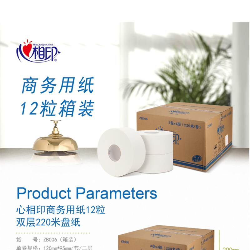 心相?。∕ind Act Upon Mind) ZB006 商用大盤紙 衛(wèi)生紙 大卷紙 240米公用雙層廁紙 12卷/箱