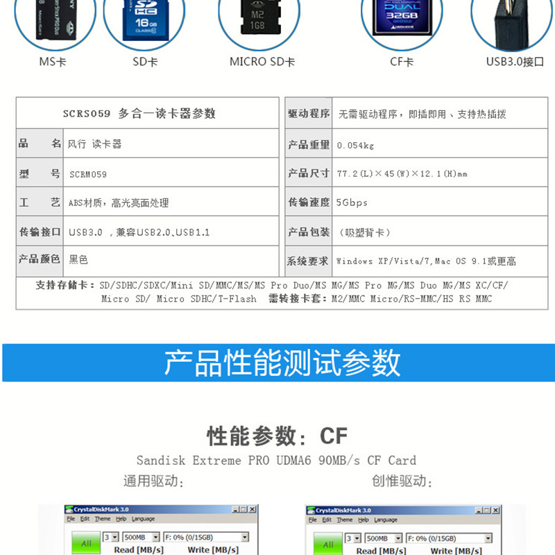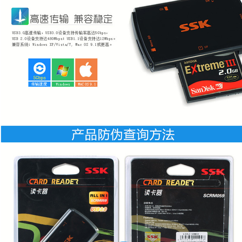 飚王(SSK) SCRM059 多功能合一讀卡器 USB3.0高速讀寫 支持TF/SD/CF/MS手機(jī)卡相機(jī)卡