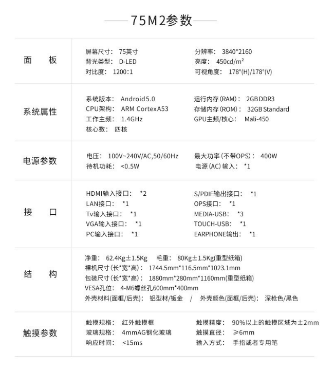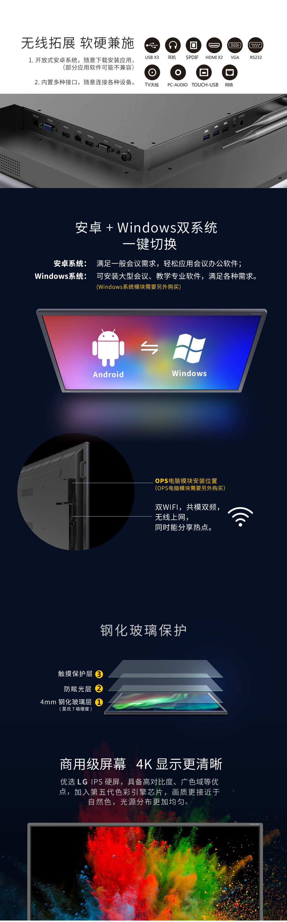 • 55英寸全高清 65英寸/4K超高清 75英寸/4K超高清 86英寸/4K超高清 98英寸/4K超高清