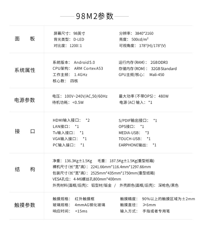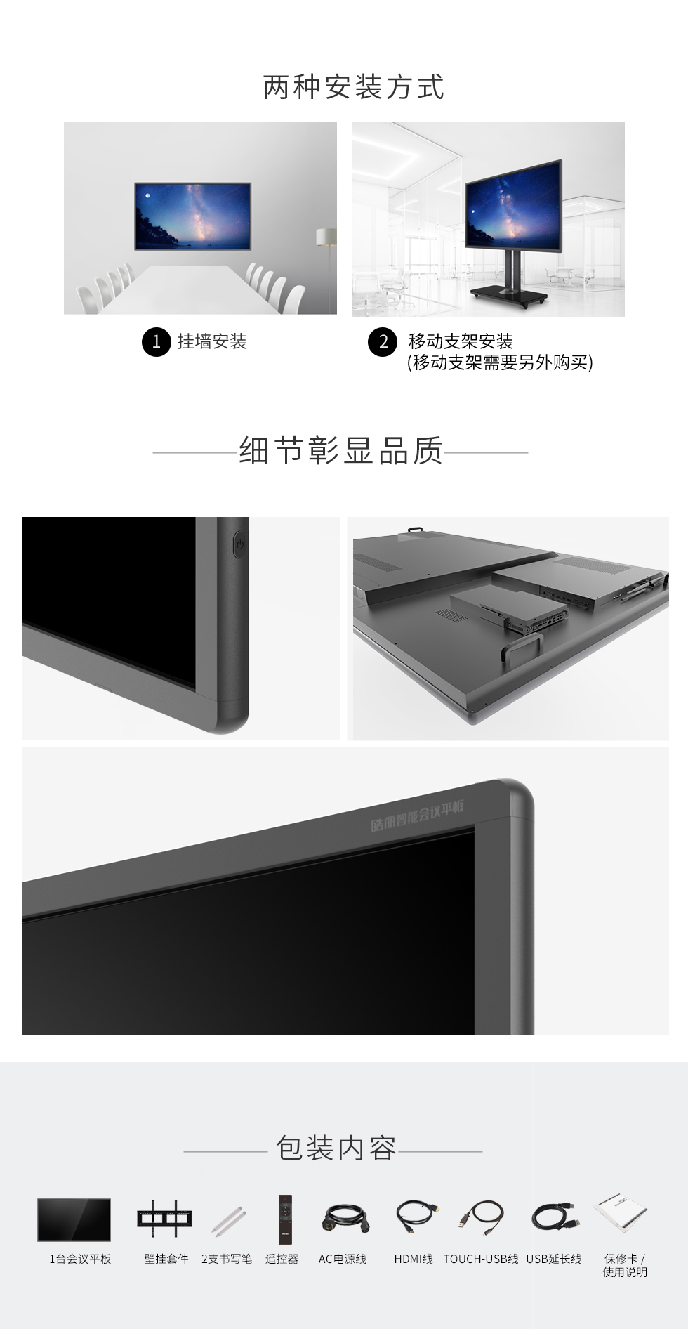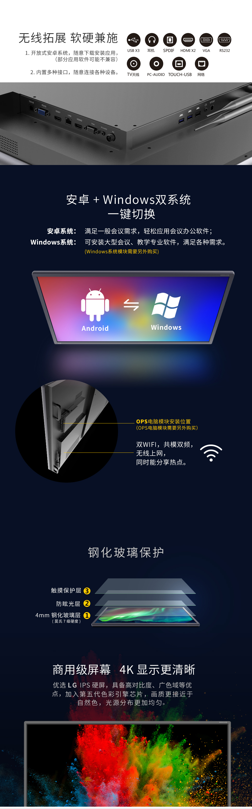 • 55英寸全高清 65英寸/4K超高清 75英寸/4K超高清 86英寸/4K超高清 98英寸/4K超高清