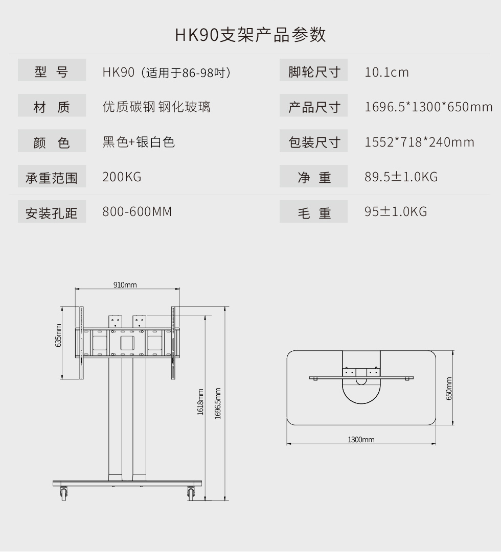 皓麗(Horion) HK90 觸控一體機U型移動支架/底座 (適用86-98英寸)